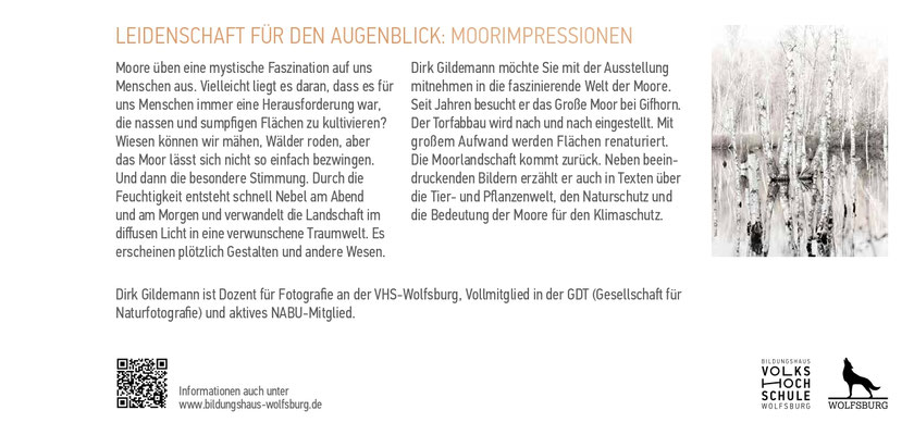 Ausstellung ab 02. Oktober 2025 bis voraussichtlich Mitte Februar 2026 in den Räumlichkeiten der VHS Wolfsburg mit Bildern und Informationen von Dirk Gildemann rund um das Moor, siehe unten.
