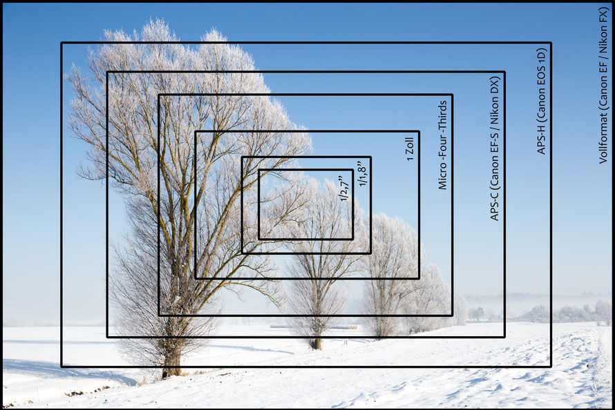 Grafik unten stellt die unterschiedlichen Sensoren-Größen da, und zeigt somit, um so kleiner der Sensor, um so kleiner der Bildausschnitt beim Fotografieren beim gleichen Standort.
