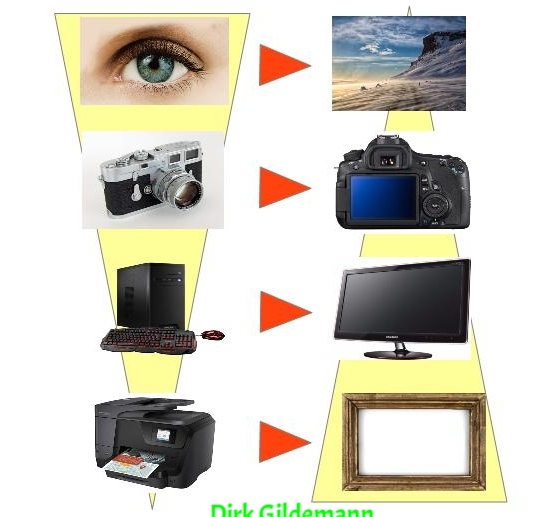 Anhand der Darstellung oben seht ihr, dass es immer eine Diskrepanz gibt zwischen dem, was wir wahrnehmen und zu dem was am Ende herauskommt! Fotografieren hat nicht den Anspruch die Wahrheit zu vermitteln. Kann es nicht, und das ist auch gut so. Fotografieren hat viel mit der persönlichen Darstellung des Objektes zu tun und mit eurer Kreativität.